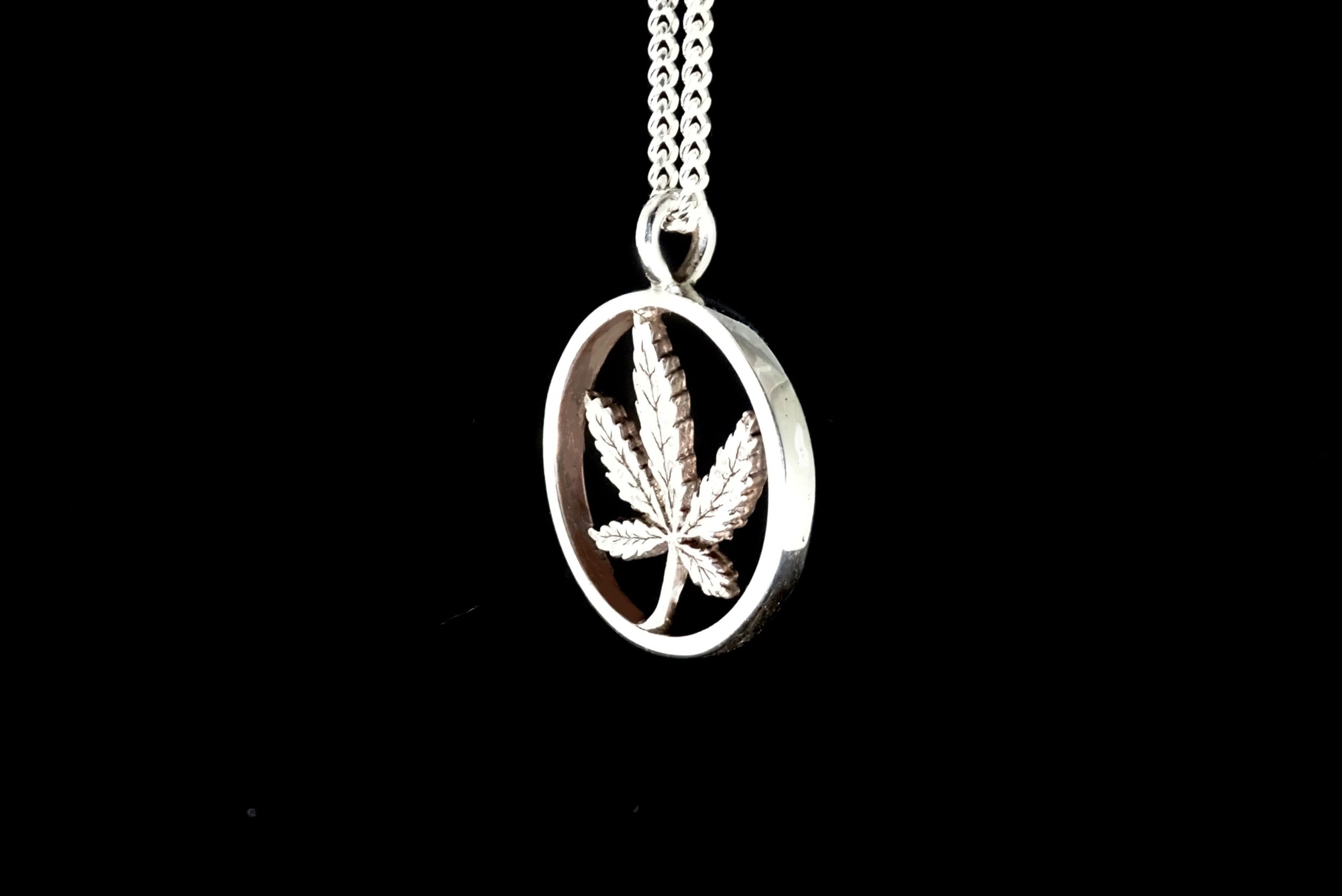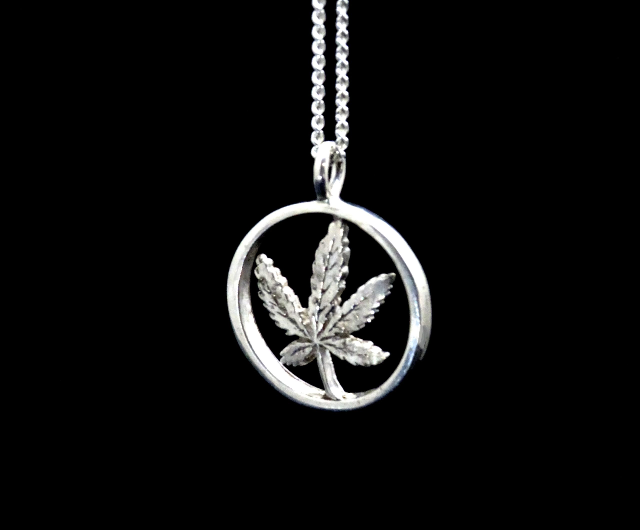 CANNABIS LEAF PENDANT INSIDE HEAVY RING WITH 18 INCH STERLING SILVER CHAIN.